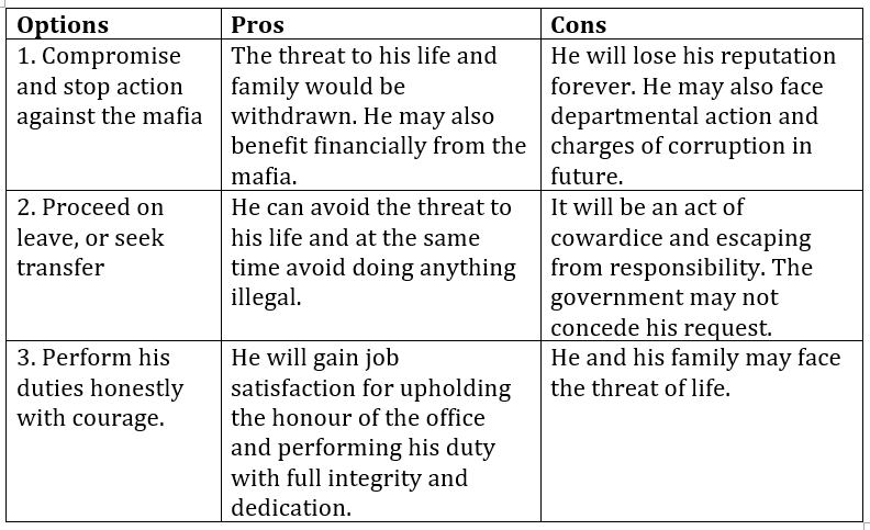 In this case, Sunil is doing his duty as a civil servant despite all odds. He is also facing a threat to life himself and his family. His different options with their pros and cons are as follows-